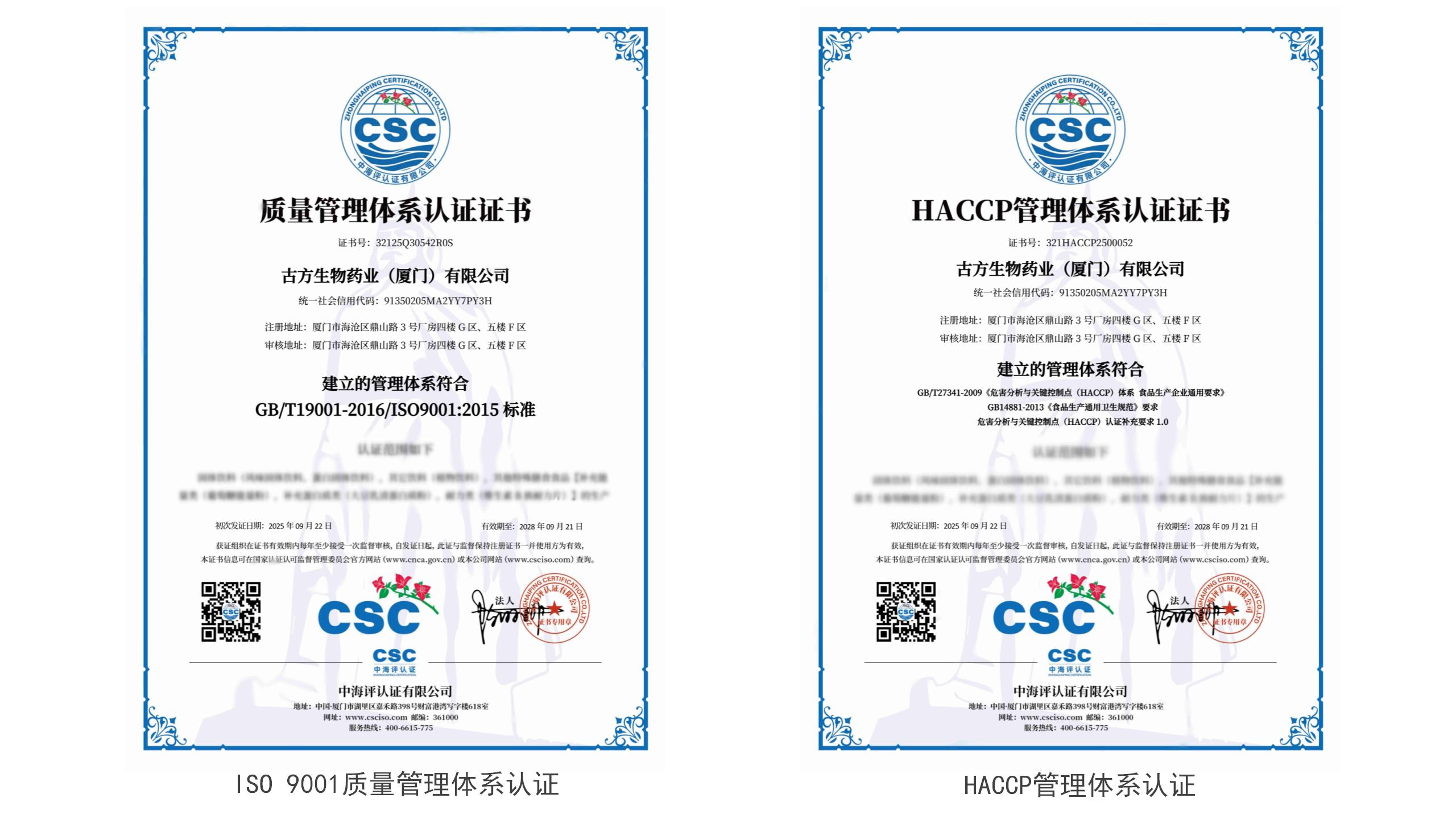 近日,经过严格的审核与评估,古方生物药业(厦门)有限公司成功通过ISO 9001质量管理体系及HACCP管理体系认证,标志着公司在产品研发、生产制造、客户服务等全流程的管理水平迈入国际化行列!这一认证不仅是对我们质量管理能力的权威认可,更是对客户长期信赖的坚实回应。